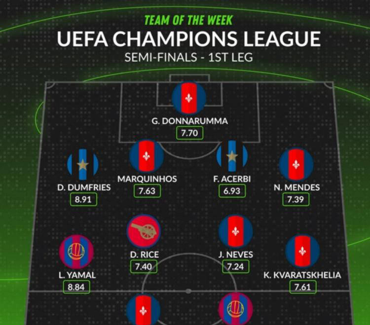 后防线上,两名边后卫分别是国际米兰的邓弗里斯和大巴黎的努诺门德斯。邓弗里斯在对巴塞罗那一战中贡献了三粒进球,展现出了极佳的状态和极强的发起能力。越到关键场次,邓弗里斯的表现越趋稳健,令人刮目相看。这一表现使他理所应当成为最佳阵容的一员。而努诺门德斯在首回合对阿森纳的防守中表现突出,有效遏制了对手的攻击,为球队创造了有利局面。
