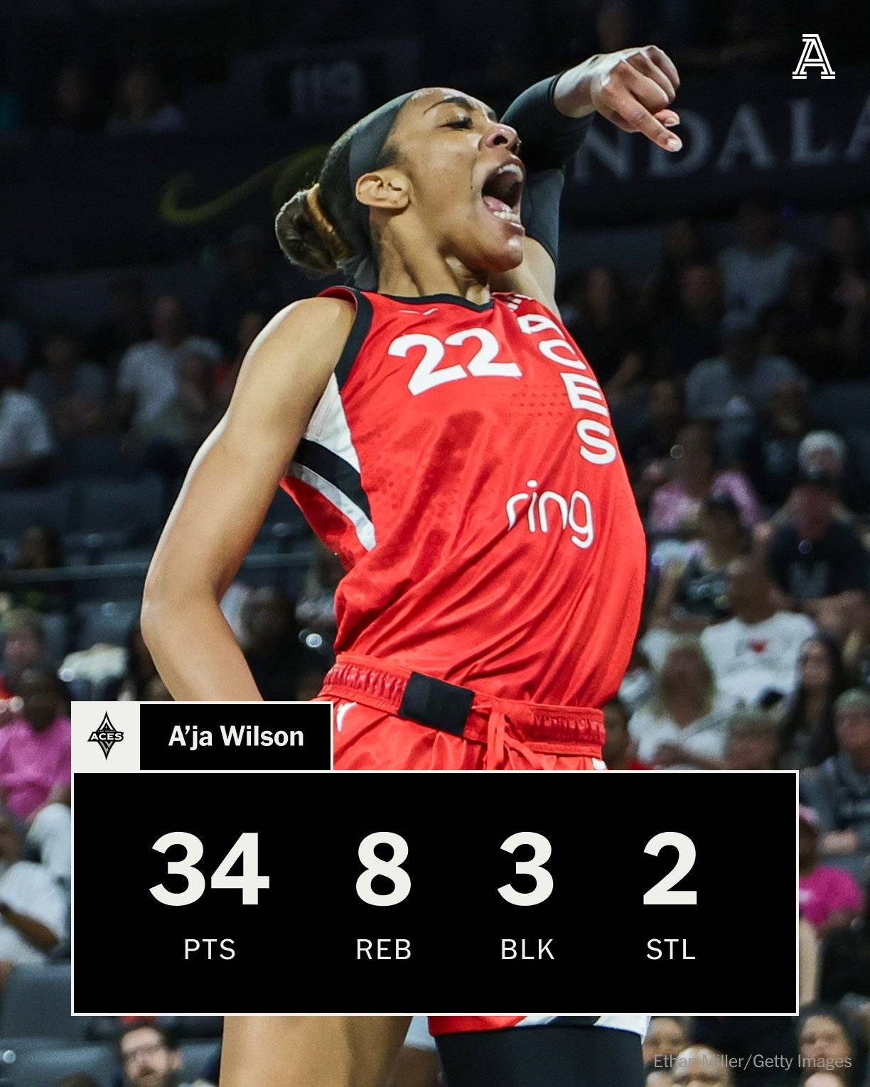 此役,阿德巴约女友、WNBA超级巨星、王牌队中锋阿贾-威尔逊她登场30分钟,16投11中,三分1中1、罚球14中11,狂砍34分8篮板1助攻2抢断3盖帽。